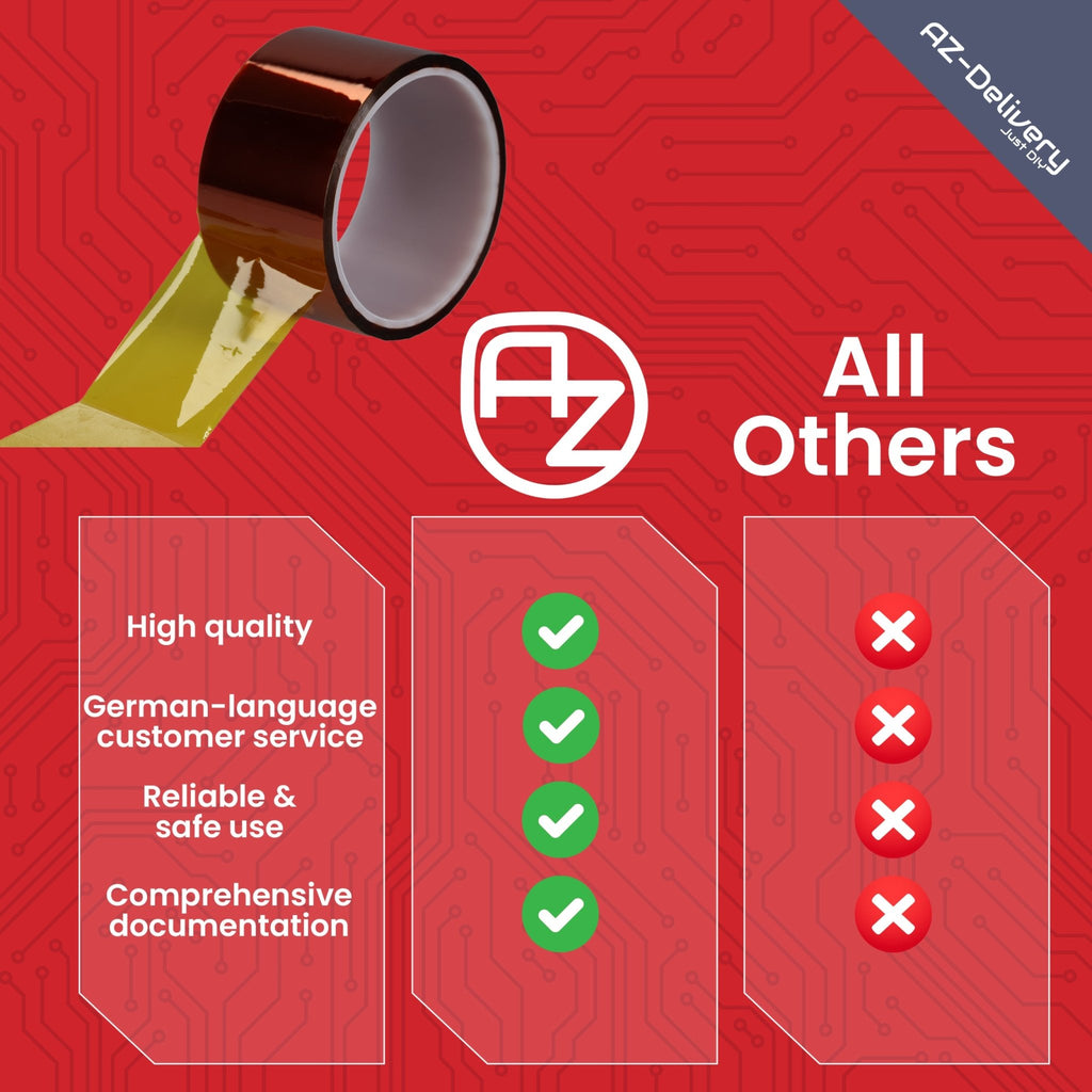 The 5 cm width and 33 m long polyimide adhesive tape offers excellent heat resistance up to 300 ° C and is perfect for technical applications such as 3D printing, sublimation pressure, electronic insulation and repairs. Thanks to the silicone adhesive that can be removed free of charge, it is ideal for sensitive surfaces. The adhesive tape consists of durable polyimide film, which is constantly against chemicals, UV rays and abrasion. Whether for high -temperature processes or everyday repairs - this heat -resistant adhesive tape meets the highest demands.