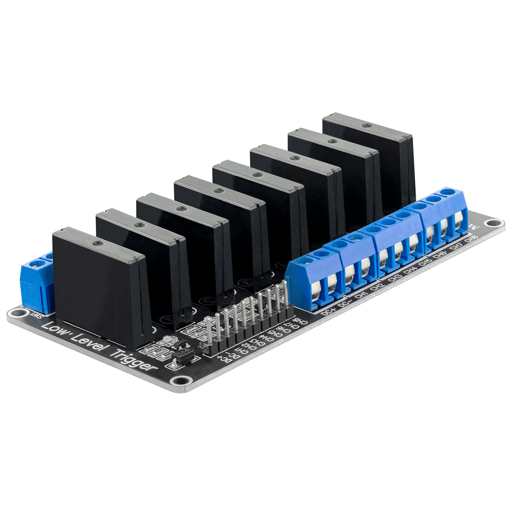 Het 8-kanaals solid-state relais (SSR) is vrij van bewegende delen dankzij solid-state technologie. Hierdoor is dit relais sneller en betrouwbaarder dan een conventioneel magnetisch relais. Het specifieke ontwerp van deze relais staat een belasting toe van 100-240V AC bij een stroomsterkte van 2A. Bovendien is elke uitgang beschermd tegen overbelasting door een pico zekering. Het gebruik van een low-level trigger maakt dit relais compatibel met alle microcontrollers met tenminste een 3,3V logisch niveau.