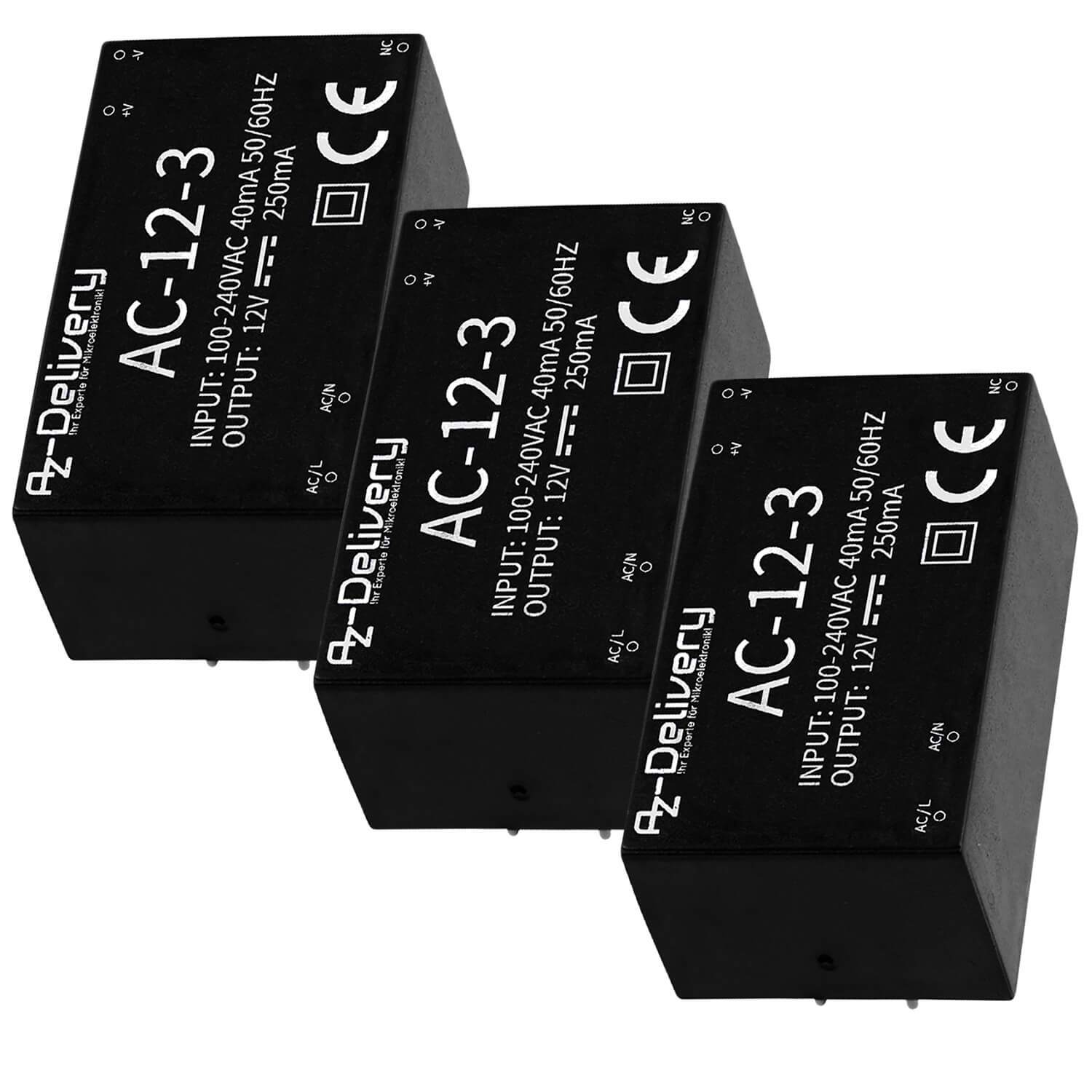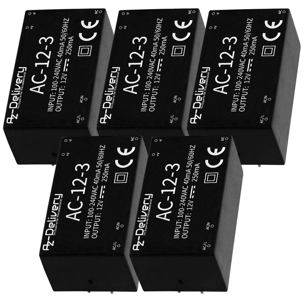 - Mit dem AZ-Delivery AC-12-3-Netzteil können Sie 220V Wechselstrom aus der Steckdose in 12V Gleichstrom mit bis zu 0,25A (3W) transformieren. Die geringe Größe erlaubt den flexiblen Einsatz Ihrer Schaltungen auch bei wenig Platz. Die große Eingangstoleranz von 100-240V AC und 50-60Hz macht Ihren Aufbau gleichzeitig kompatibel für den weltweiten Anschluss ans Stromnetz.